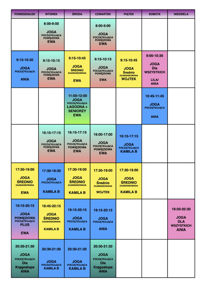 Grupa Powięziowa Początkująca Plus (w poniedziałki) przeznaczona jest dla osób praktykujących minimum pół roku na grupie początkującej. Średnio zaawansowana jest dla tych, którzy na początkującej ćwiczyli minimum rok albo dostali informację od nauczyciela, że mogą do tej grupy dołączyć.